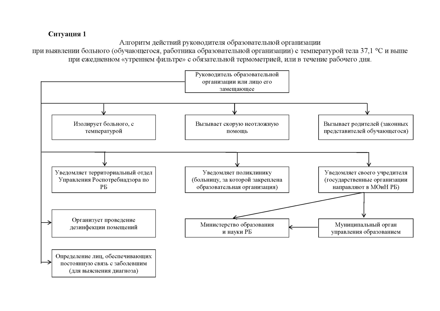 Министерство образования и науки Республики Башкортостан направляет алгоритм действий руководителя образовательной организации при выявлении больного (обучающегося, работника образовательной организации) с температурой тела 37,1 °С и выше при ежедневном «