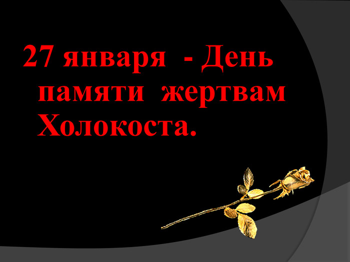 27 января – является памятной датой – это Международный день памяти жертв Холокоста, установленный Генеральной Ассамблеей ООН 1 ноября 2005 г. Дата связана с освобождением в 1945 г. войсками советской армии концлагеря Освенцим (Аушвиц, сегодня это музей жертв Холокоста), в котором было уничтожено более одного миллиона евреев. Холокост (произошло от древнегреческого языка, что переводится как «сожжение всех и вся») признан одним из самых страшных в мировой истории преступлений против человечества.
