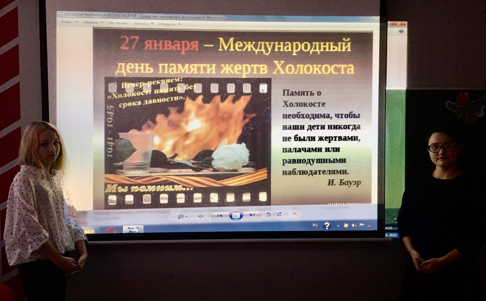 С 20 по 28 января 2022 года в нашей школе проходит неделя Памяти жертв Холокоста, посвященная Международному дню памяти жертв Холокоста и 77-летней годовщине освобождения лагеря смерти Аушвиц (Освенцим) Советской армией.