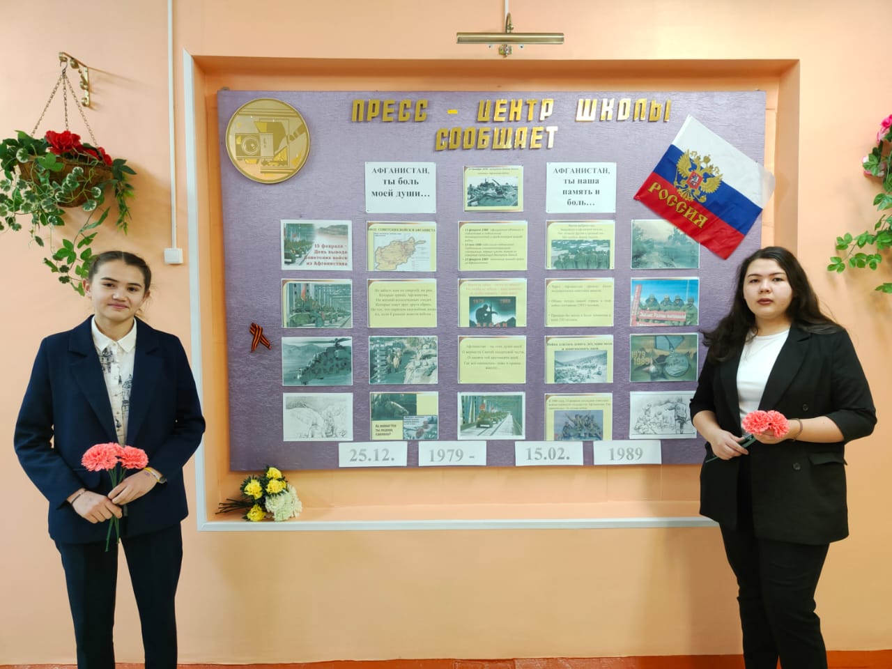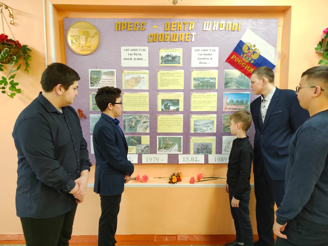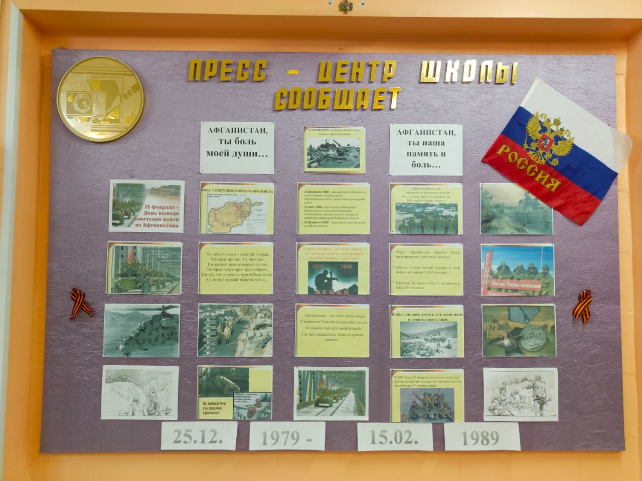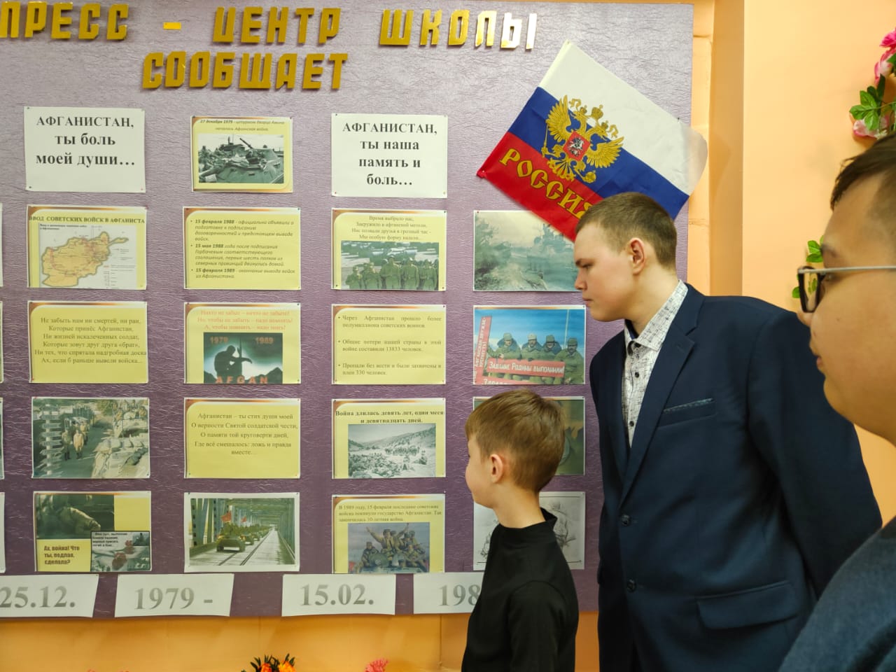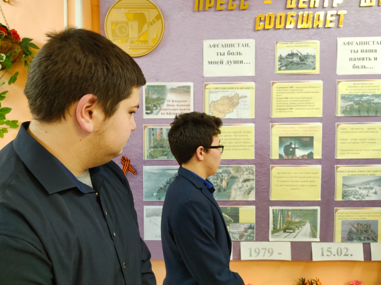 В нашей школе представители Совета Старшеклассников оформили стенд «Афганистан – наша память и боль…». Стенд оформлен с целью воспитания патриотизма через уважительное отношение к событиям, связанным с армией; знакомства с судьбами воинов-афганцев и участников локальных войн; сохранения памятных традиций.