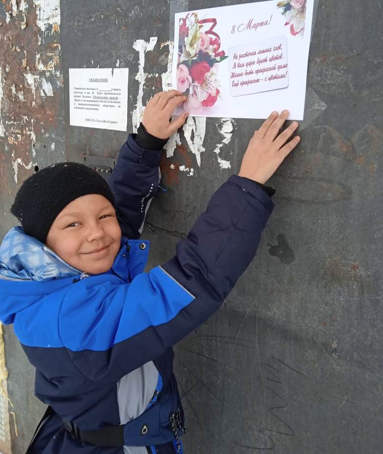 В нашей школе существует давняя традиция поздравлять жителей города с главными праздниками любимой страны! Женский день, 8 марта, не стал исключением! Учителя, дети и их родители снова приняли участие в акции «Праздничное настроение», развесив открытки на подъездах жилых домов. Думаем, наши поздравления ещё больше подняли настроение в этот замечательный весенний день! С 8 марта!!!
