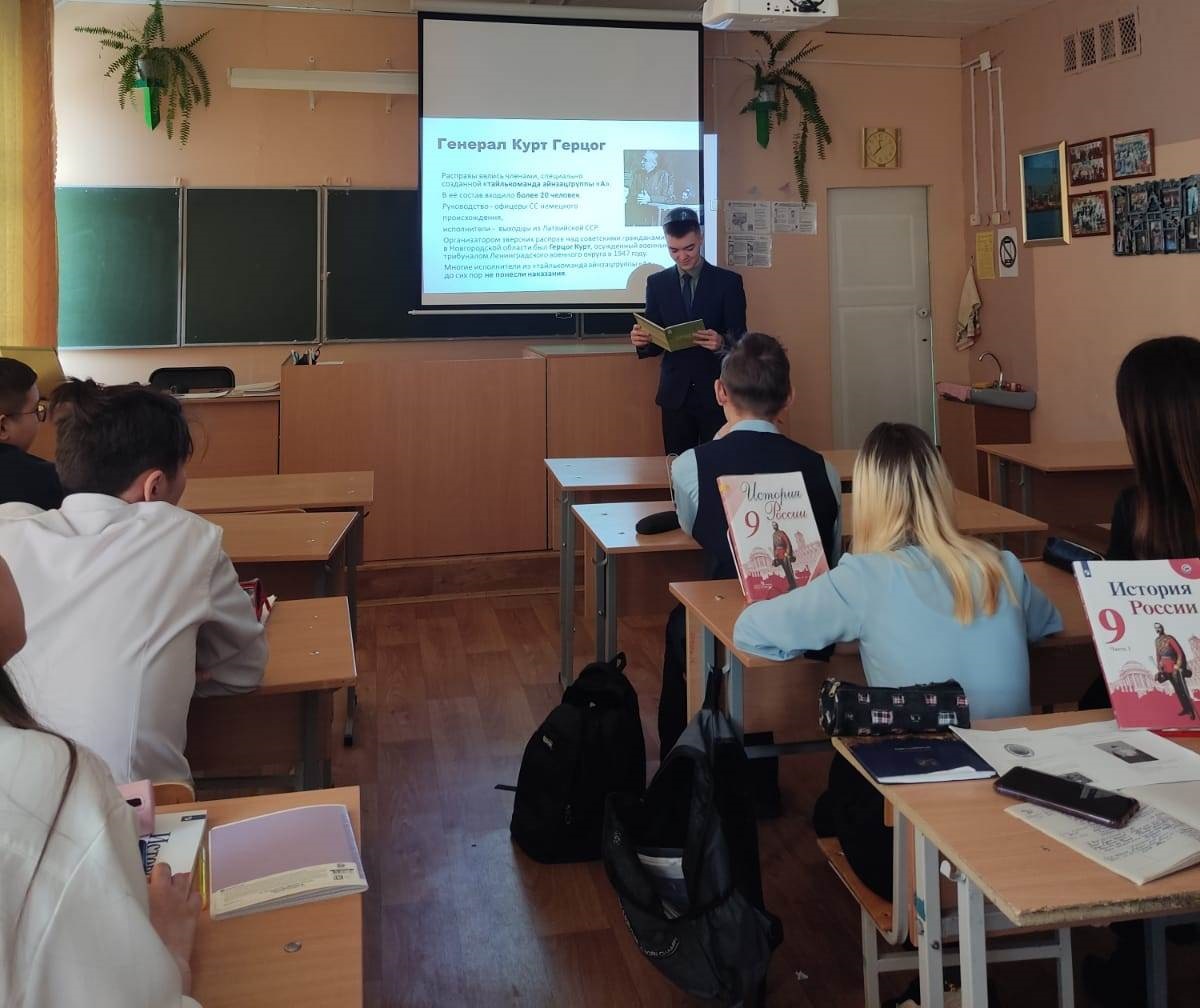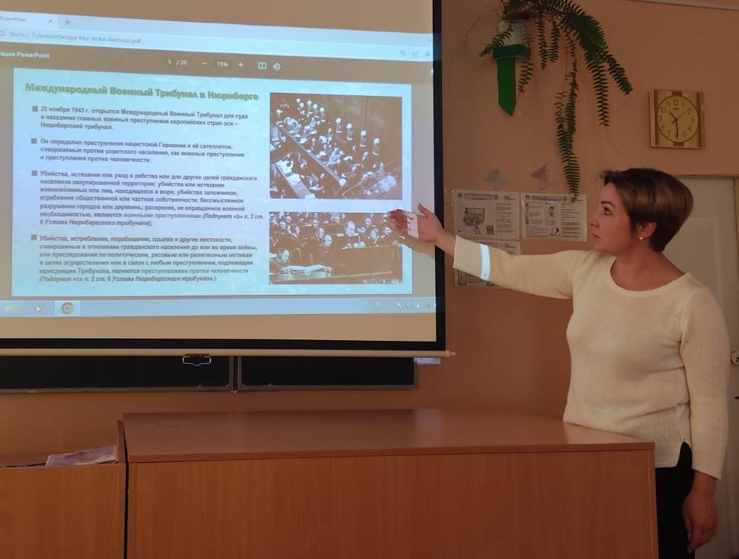 19 апреля в рамках реализации плана Дня единых действий в память о геноциде советского народа нацистами и их пособниками в годы Великой Отечественной войны прошли уроки Памяти. Целью уроков – это актуализация знаний у учащихся о понятиях геноцид, о многочисленных преступлениях фашистов, которые были осуждены Нюрнбергским процессом.