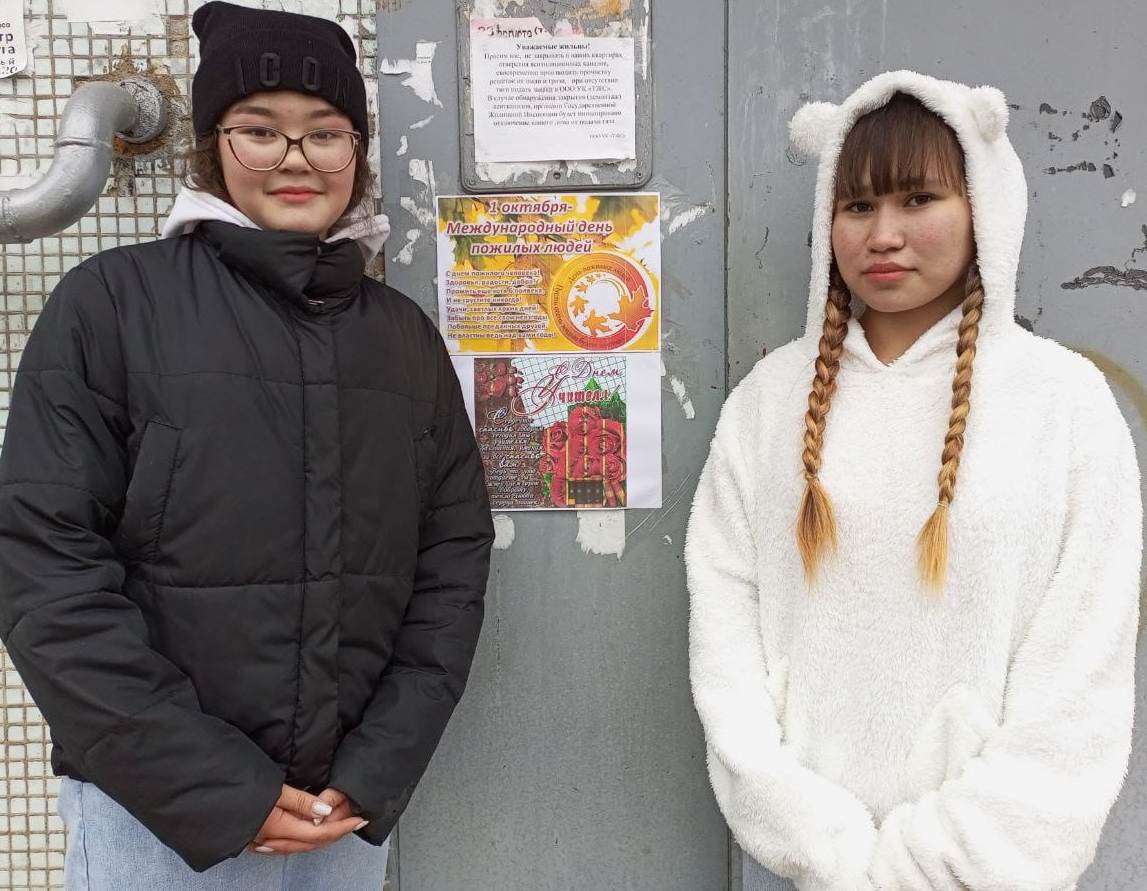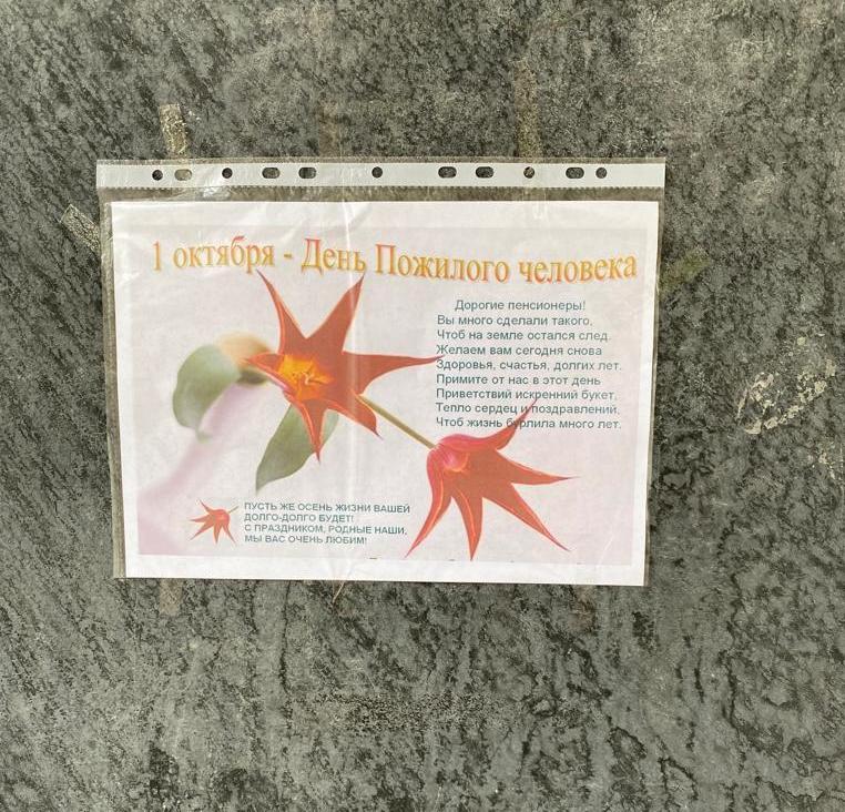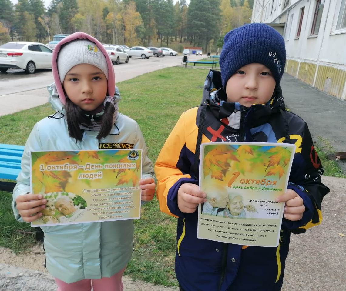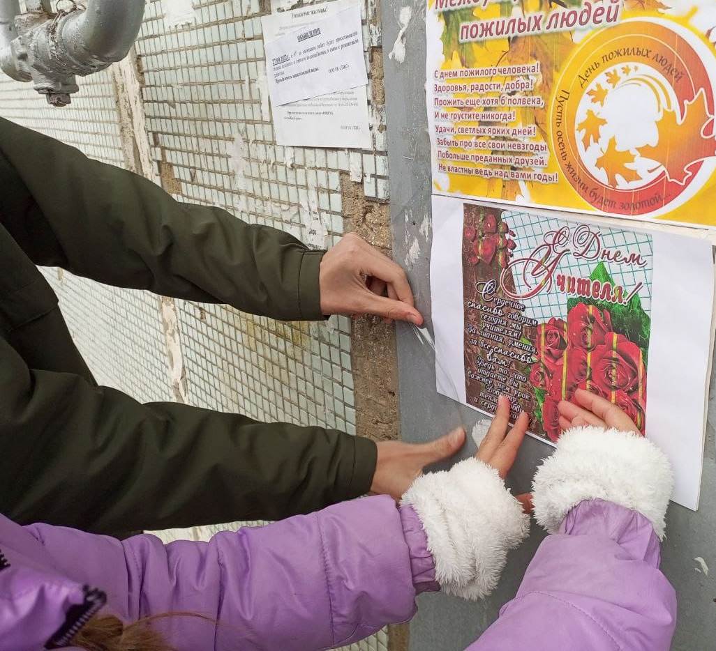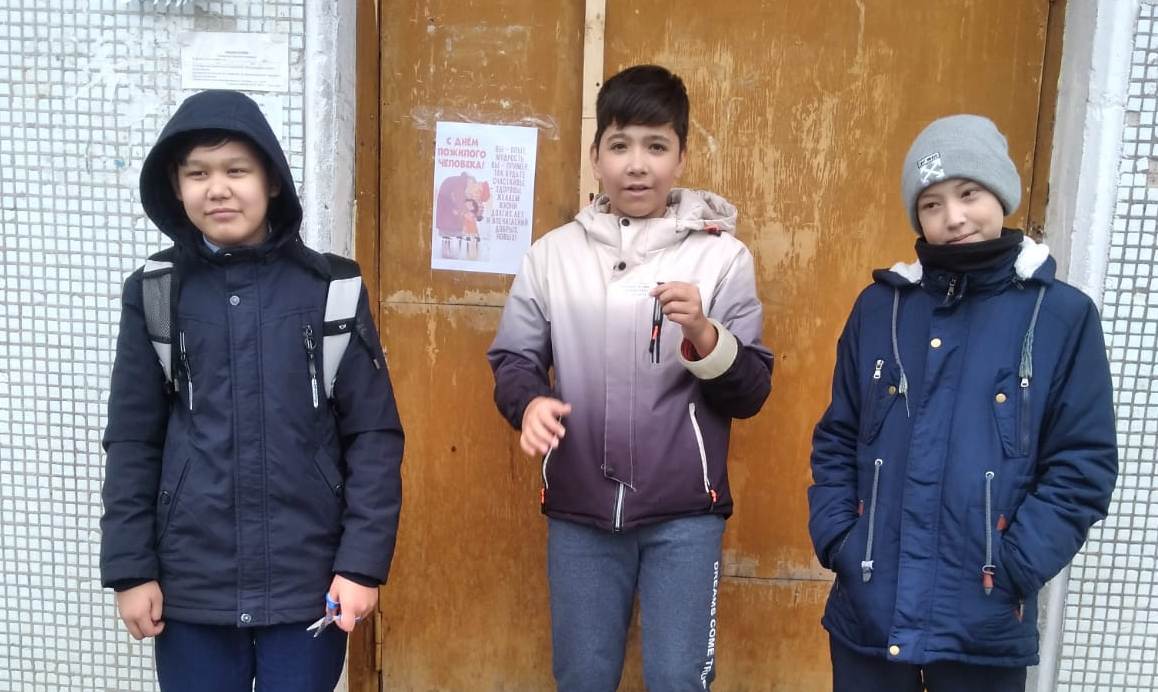 В этот день учащиеся нашей школы провели акцию «День добра и уважения» в рамках празднования Дня пожилого человека. Участники акции расклеили поздравительные листовки на подъездах домов с праздником и с пожеланиями добра.
