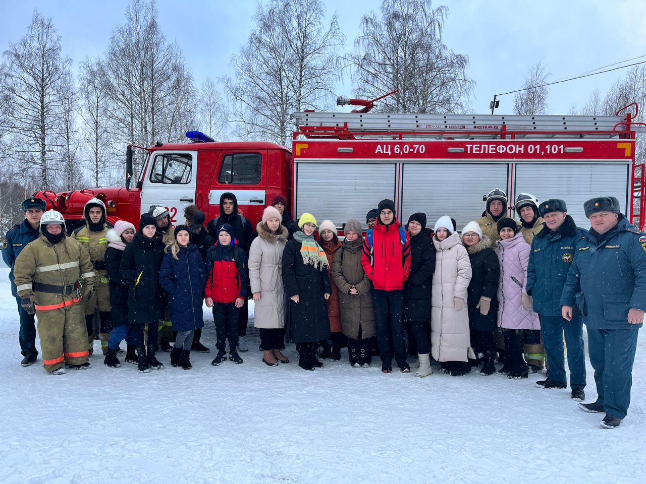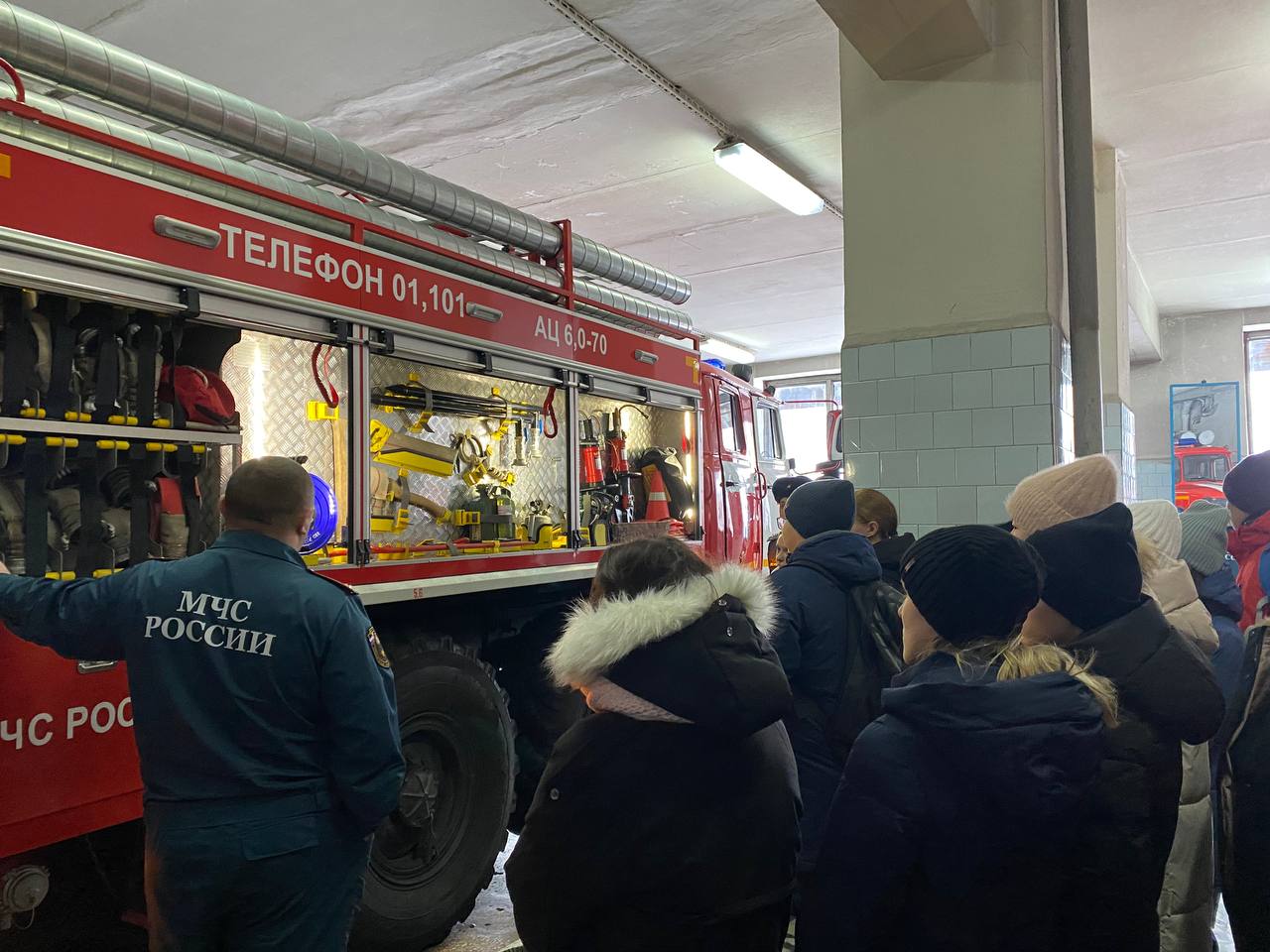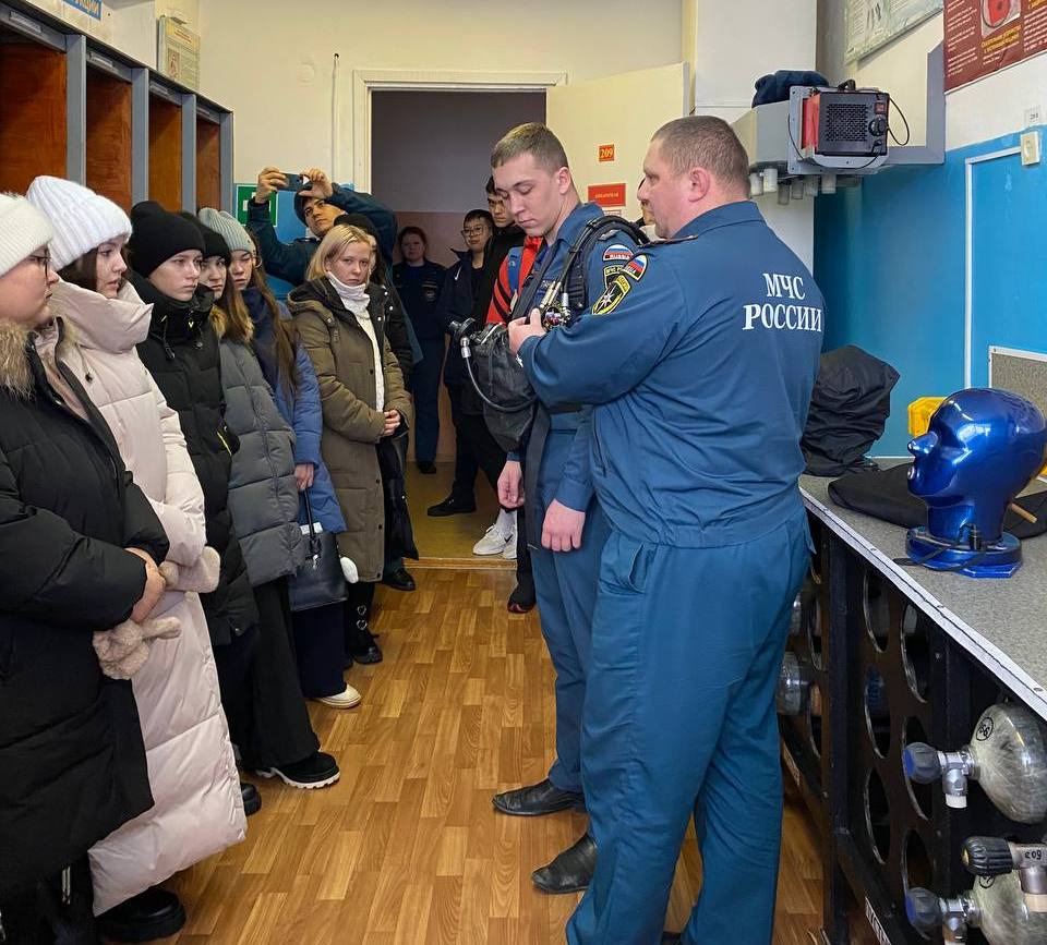 Зрелищное действие происходит в гараже боевых машин, пожарные показали старшеклассникам предметы боевой одежды и пожарно-спасательное оборудование. Все желающие смогли примерить боевую одежду пожарного, оценив её тяжесть и удобство в использовании. Также ребята увидели показательное выступление самоспасание с высоты, сбор и выезд дежурного караула по тревоге и подачу ствола первой помощи от пожарного автомобиля в очаг пожара. Огнеборцы рассказали, что одежда служит для защиты от воды, высокой температуры и получения травм при тушении пожаров. Объяснили, что изготовлена одежда из брезента со специальной пропиткой, чтобы не воспламенялась и не промокала. Обратили внимание ребят, что у пожарной каски наверху есть гребень для защиты от ударов. Ребята задавали много вопросов пожарным и получали исчерпывающие ответы. В конце экскурсии ребята сделали общее фотографию с пожарными и поздравили с Днем спасателя России.