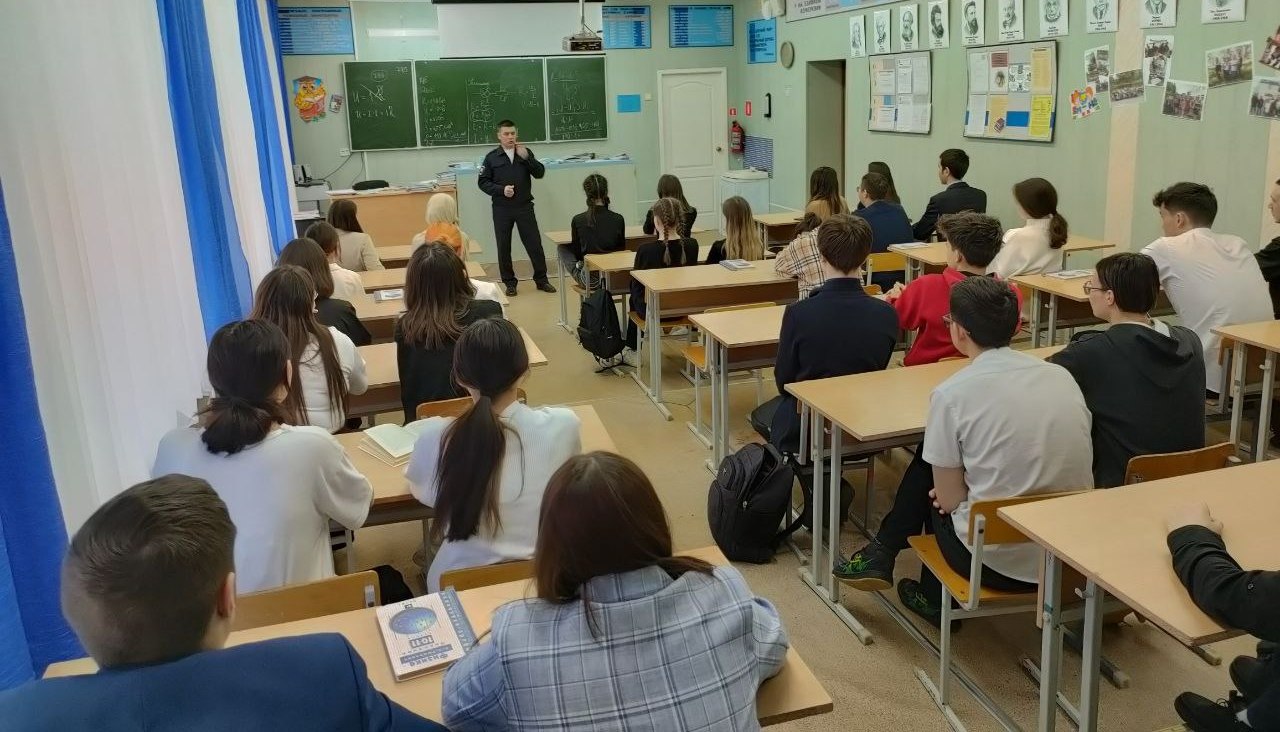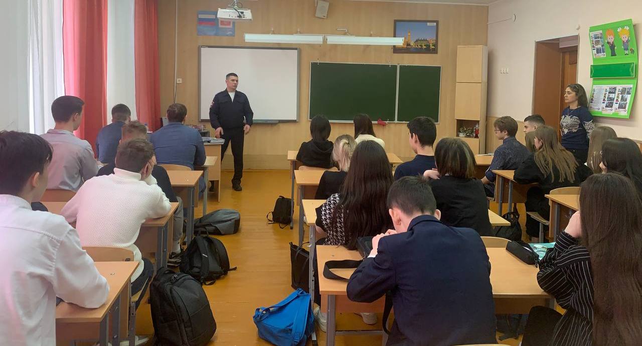 Андрей Николаевич выступил перед учащимися старшей школы. Инспектор полиции напомнил учащимся об ответственности за нарушение правил дорожного движения и обозначил основные причины дорожно-транспортных происшествий.