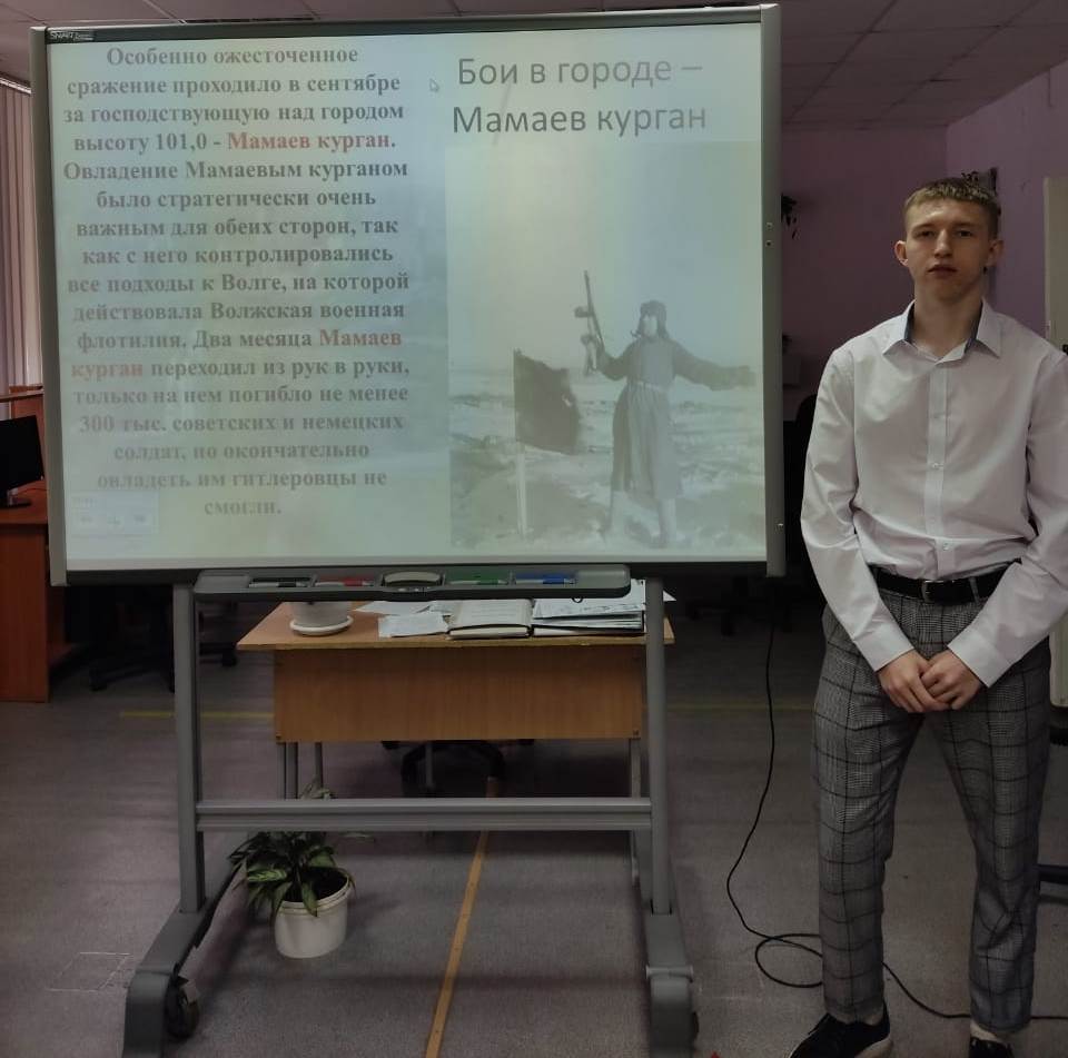 19 ноября 2021 года, в 9 и 11 классах прошёл урок памяти "Сталинградская битва. Коренной перелом в войне" (учитель Сидорова С. П.). Ученики обсудили значение Сталинградской битвы, вспомнили героическую оборону дома Павлова и бои за Мамаев курган.