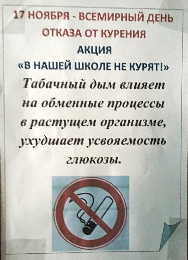 23 ноября 2021 года в рамках правовой декады «Имею право на права», в рамках всероссийской межведомственной комплексной оперативно-профилактической операции «Дети России – 2021» состоялась акция «В нашей школе не курят». Представители Совета старшеклассников выпустили листовки с высказываниями о вреде курения, развесили их в классных кабинетах, распространили среди обучающихся.