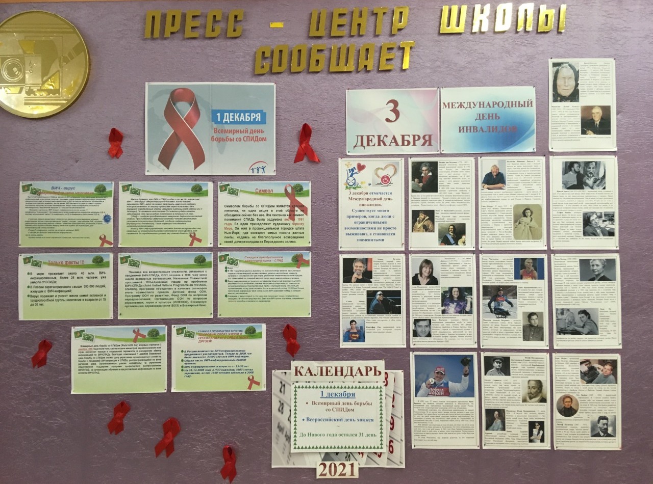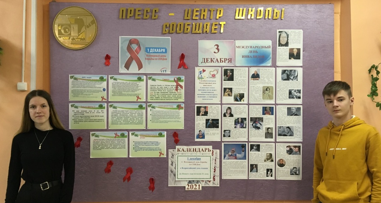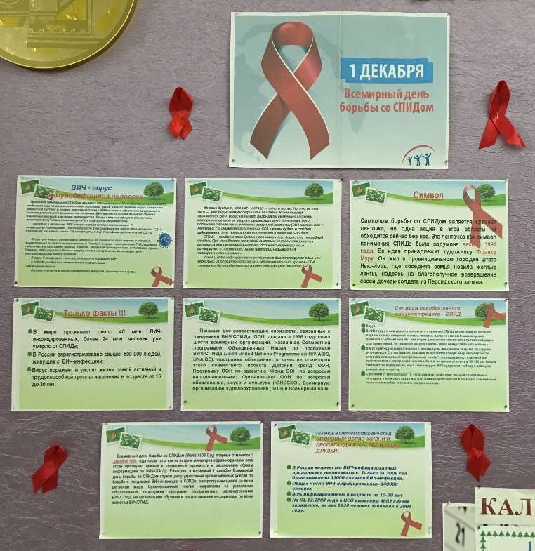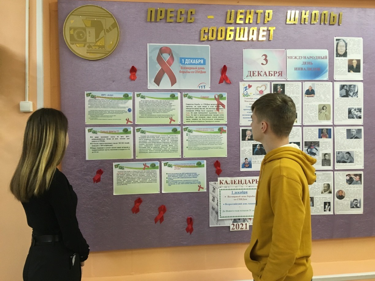 Ко Всемирному дню борьбы со СПИДом представители Совета старшеклассников школы оформили стенд, где поместили полезную информацию об этом страшном недуге.