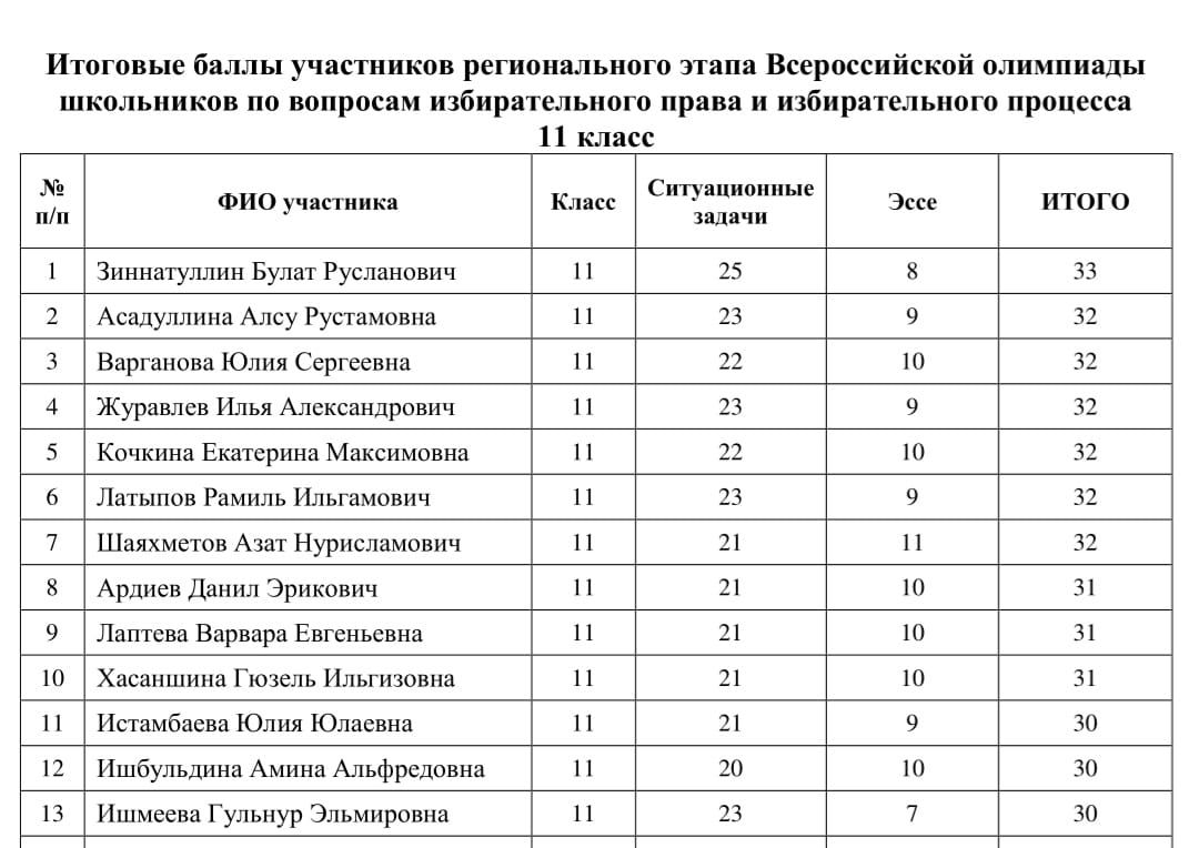 Заключительный этап олимпиады будет проводиться в Центральной избирательной комиссии Российской Федерации. Комиссия по проведению регионального этапа Всероссийской олимпиады школьников по вопросам избирательного права и избирательного процесса проверила работы участников олимпиады и определила результаты. Ознакомиться с результатами можно на официальном сайте Центризбиркома республики http://www.bashkortostan.izbirkom.ru/ в разделе «Софиум».