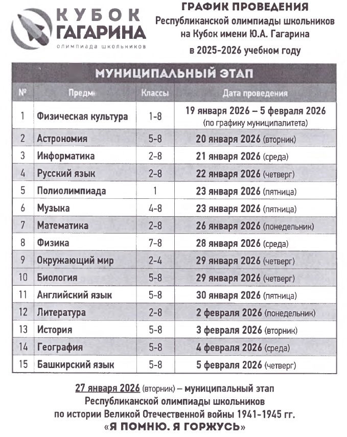 - График проведения Республиканской олимпиады школьников на Кубок имени Ю.А. Гагарина в 2025-2026 учебном году